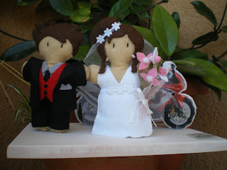 Pero qué pasada!!!!! Me encanta!!!!! Los novios están lindisimos!!!Y la idea de la moto es genial!!! Fijate que este fin de semana quiero hacer una pareja de novios muy especial, que justo dentro de un año estaré en la boda de una prima de mi marido y un antiguo compañero de clase y a los dos los aprecio mogollon y me encuentro con tu pareja de novios!!jeje. pero la idea de la moto me ha fascinado!!! Y... está hecha tambien de fieltro verdad?? ay!! me encantaria saber como lo has hecho, supongo que con el ordenador, pero ni idea. Bueno, que me enrollo, jeje. Que vivan los novios!!!!!!!