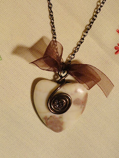 Esta piedra con forma de corazon la compre en natura, la llevaba en el bolso y he decidido engarzarla con acero magico en tonos marrones a juego con el dibujo de la piedra y como adorno en la cadena unas bolas forradas de hilo en tonos marrones. Este es para mi.