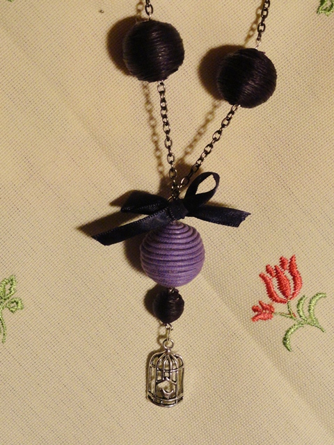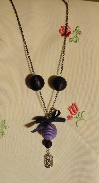 Este es de cadena, con dos bolas de papel forradas a mano con hilo encerado en color morado, como pieza central lleva una bola forrada con cordon de cuero en lila y otra pequeña de hilo encerado en morado, como colgante una jaula con pajarito.
