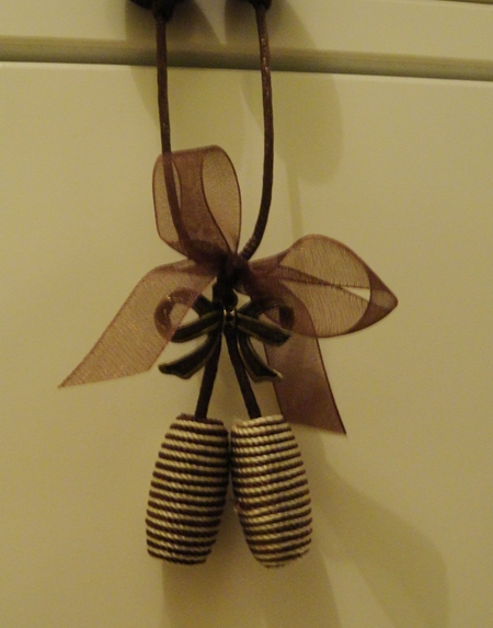 Este está hecho con hilo de cola de raton en tono marron, lleva en la cadena dos bolas forradas de hilo tambien marrones y como pieza central un lazo metalico un lacito de organza y dos bolas alargadas en forradas con hilos en tonos marron y beige. Este tambien para mí.