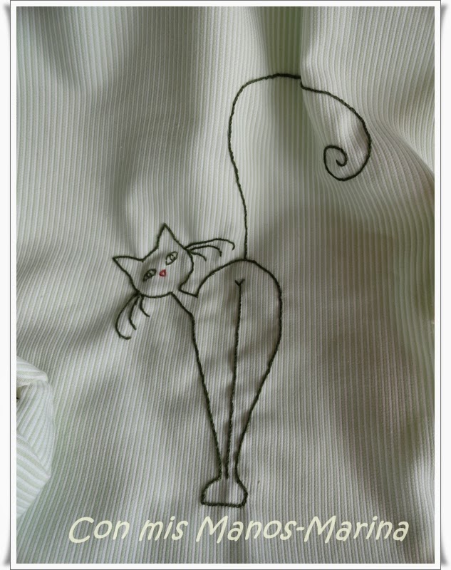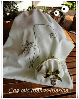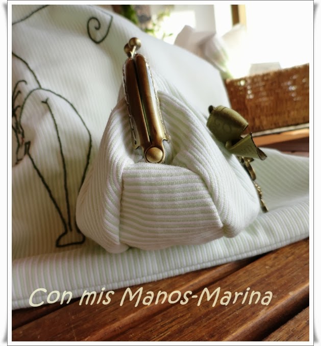 Mochila con monedero a juego. Tela blanca con rallitas muy finas en verde.